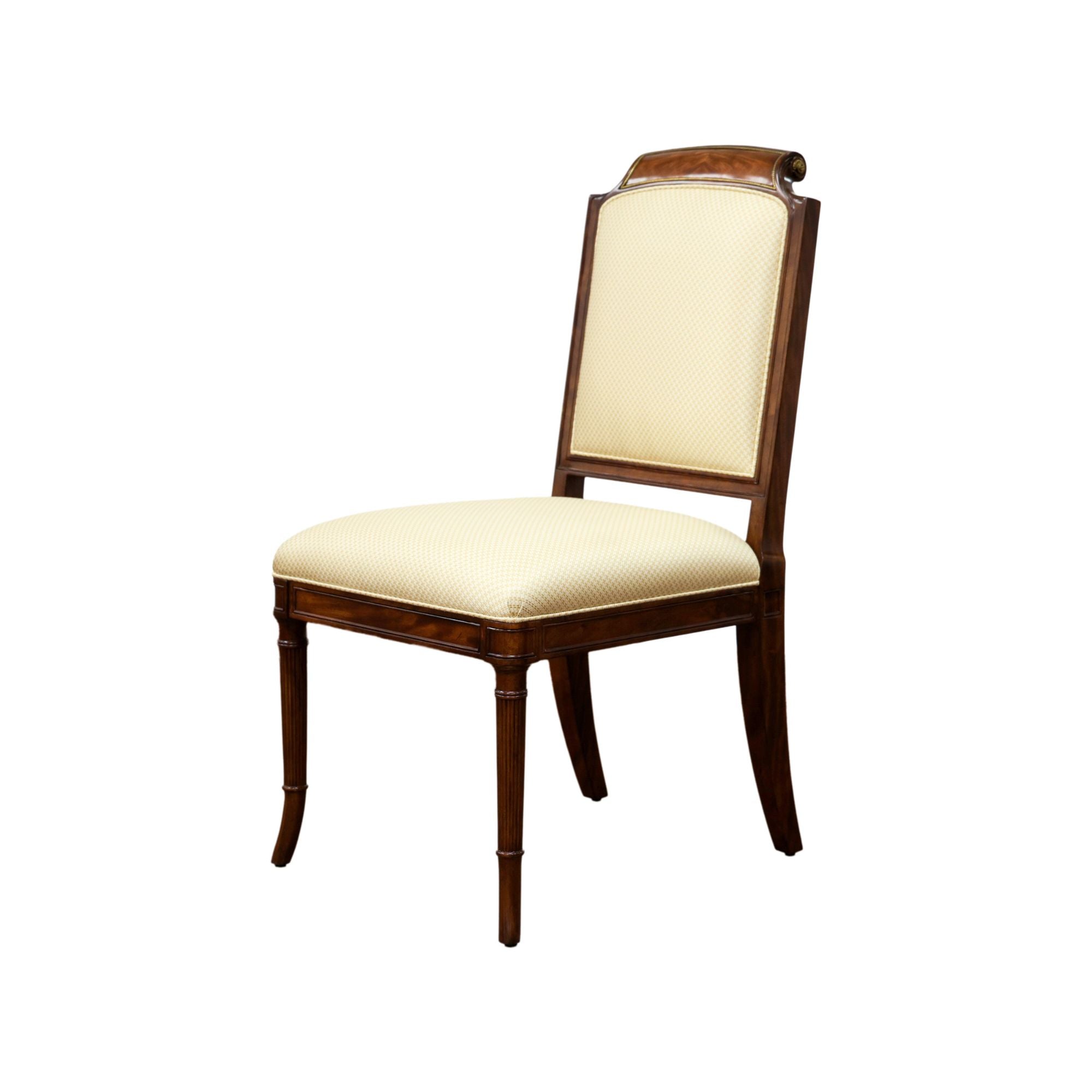 A finely carved mahogany dining chair, the upholstered framed back with a swirl mahogany veneered scroll over toprail with fine brass details, the upholstered seat on panelled seat rails with turned and fluted legs with splay feet.
