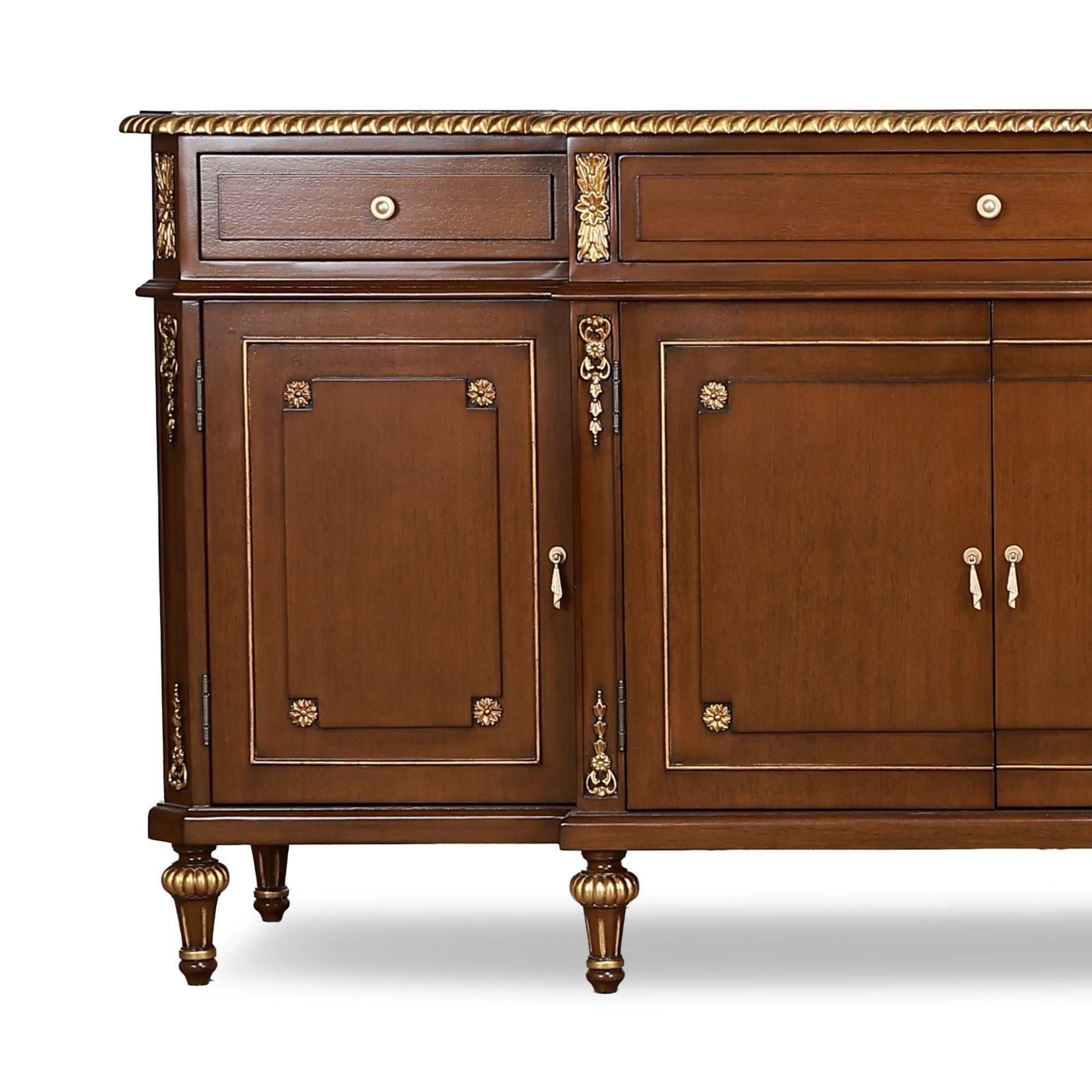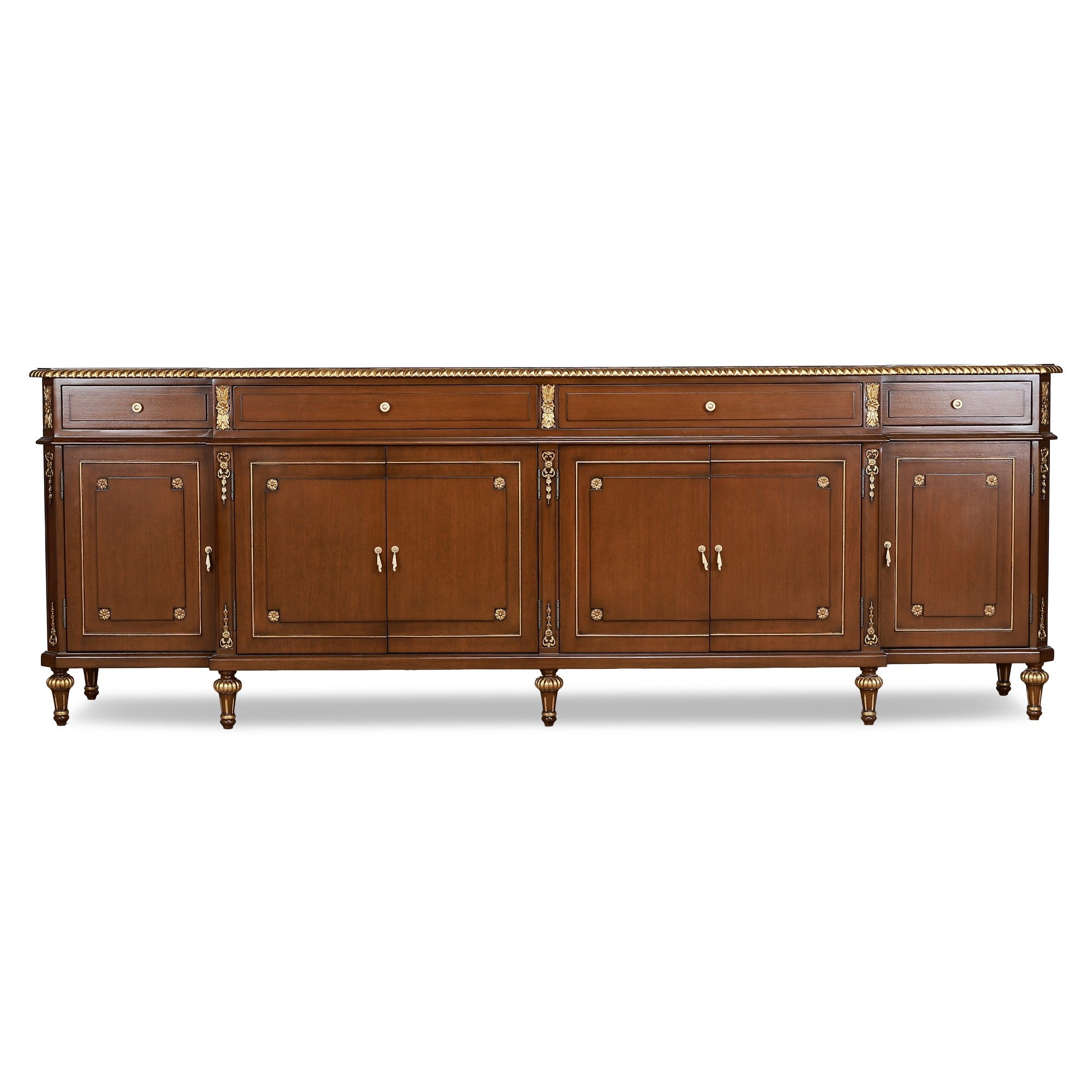 The Aveline Heritage Sideboard is a refined expression of classical craftsmanship and balanced proportion. Crafted in rich mahogany with delicate inlay detailing, this grand buffet features multiple drawers and paneled cabinet doors accented with subtle gilt embellishments.