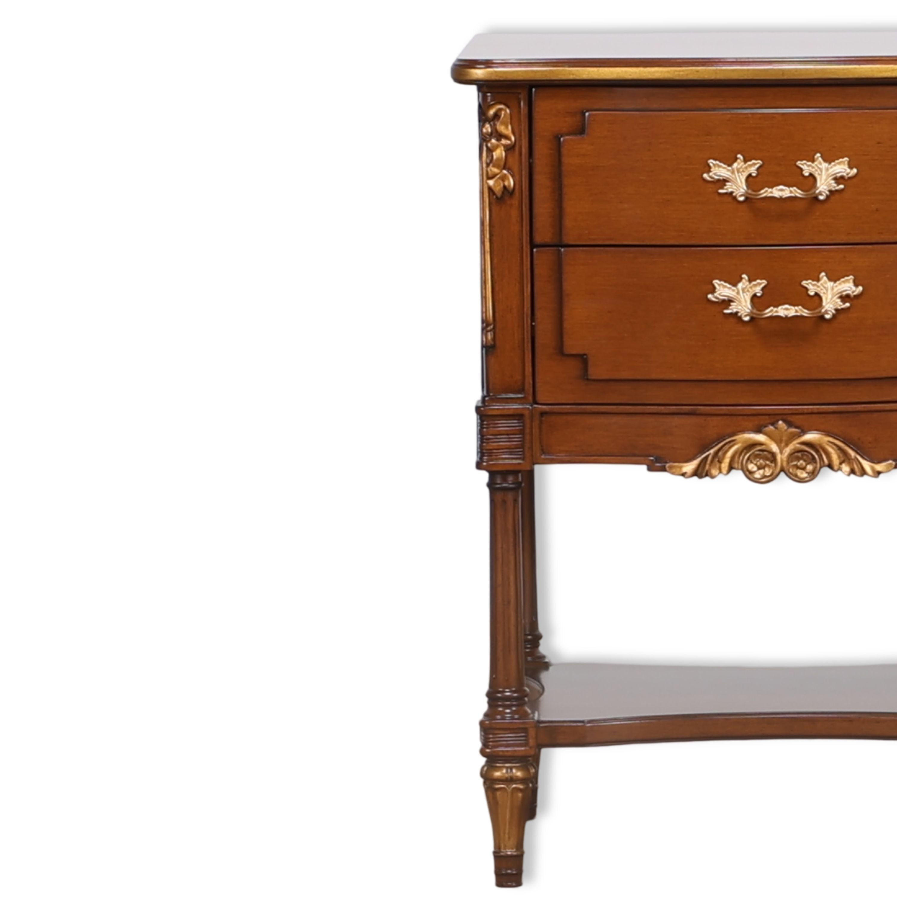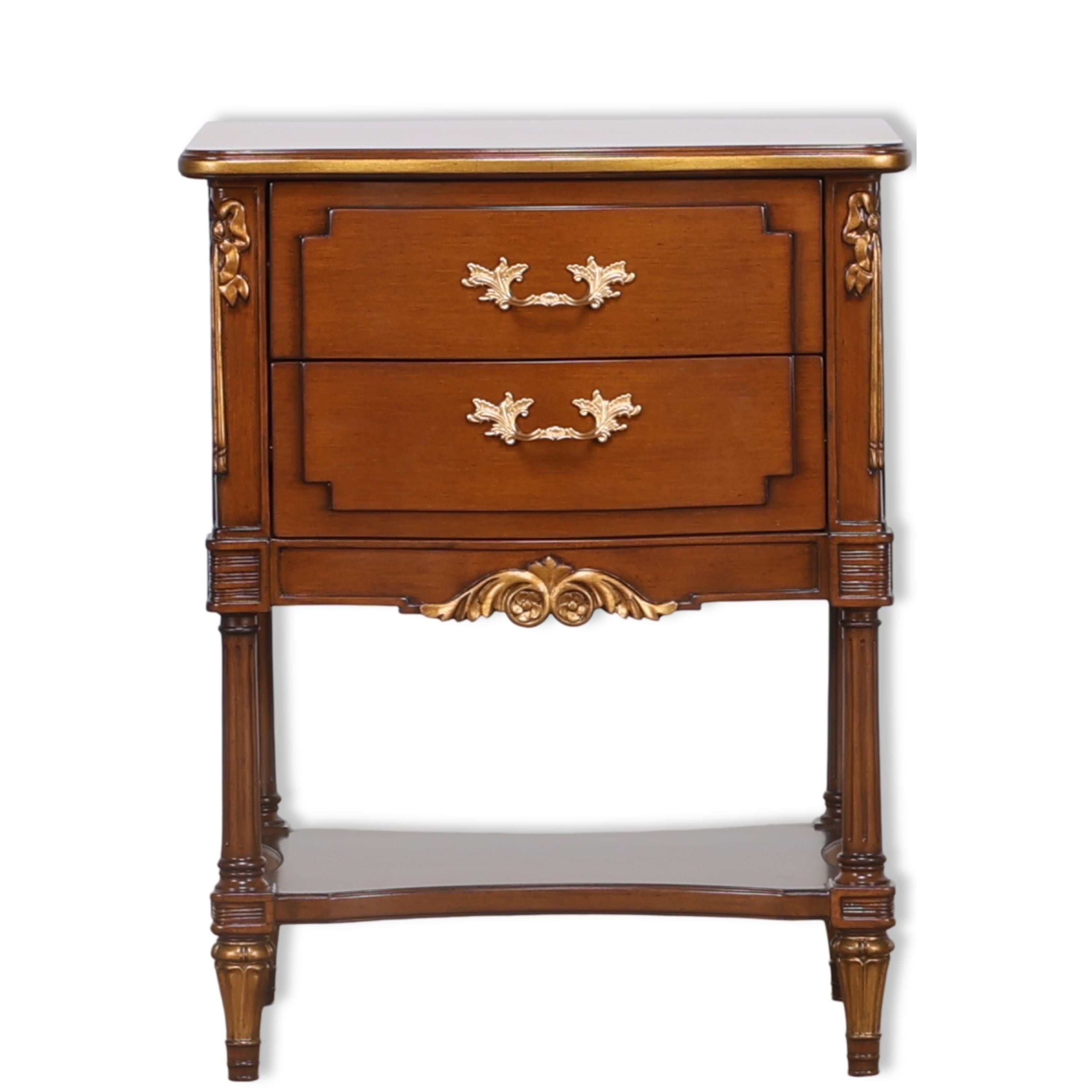 A refined bedside piece featuring a fluted leg base, floral gold appliqués, and shaped drawer fronts. Two drawers offer storage, while the lower shelf enhances both function and elegance.