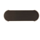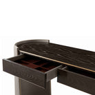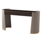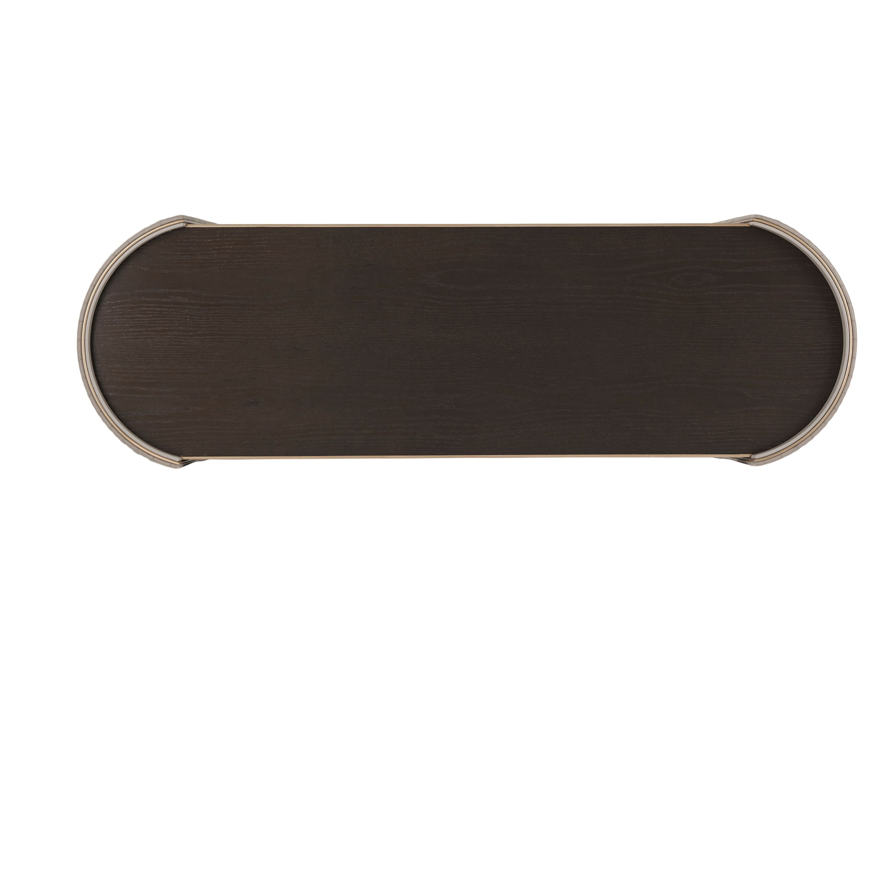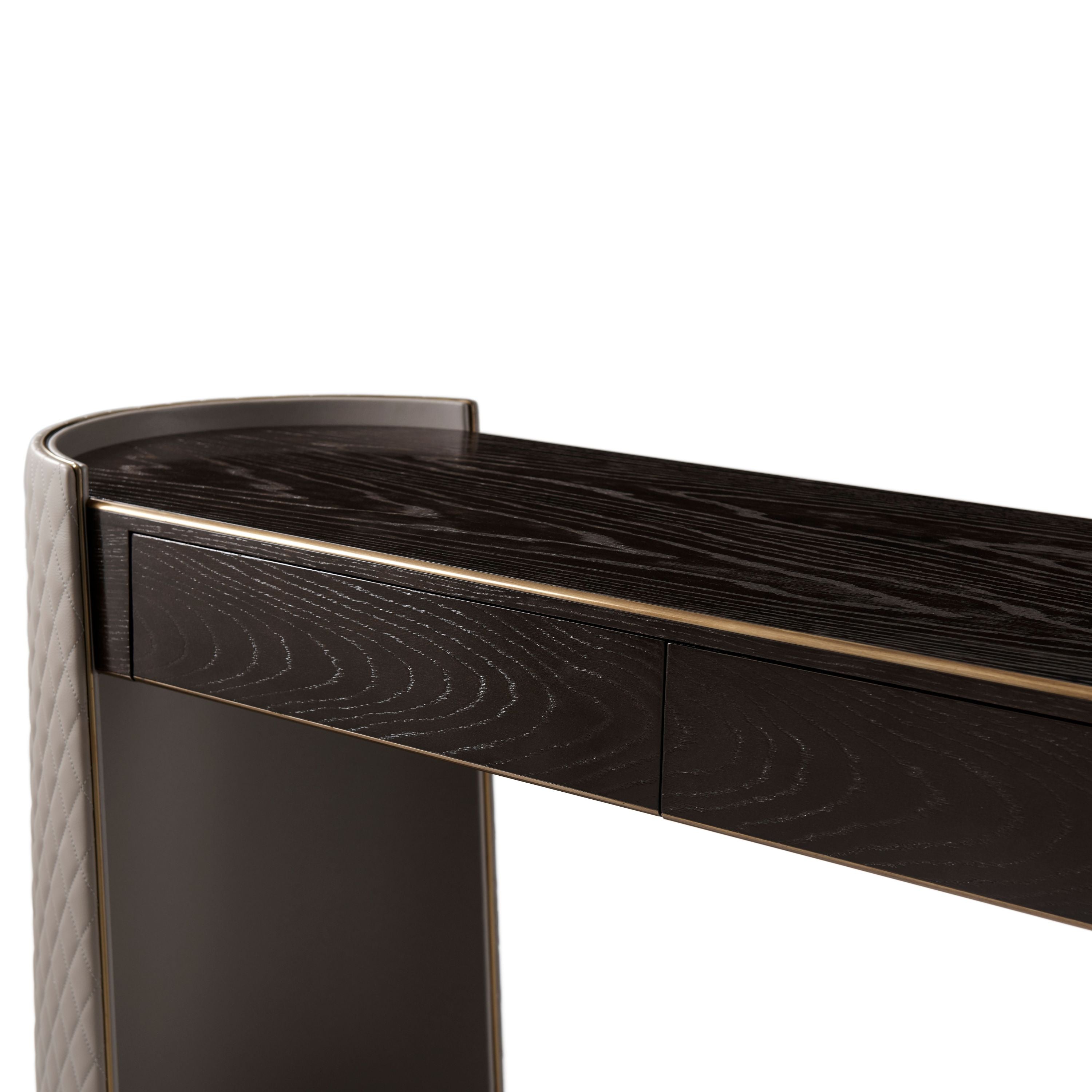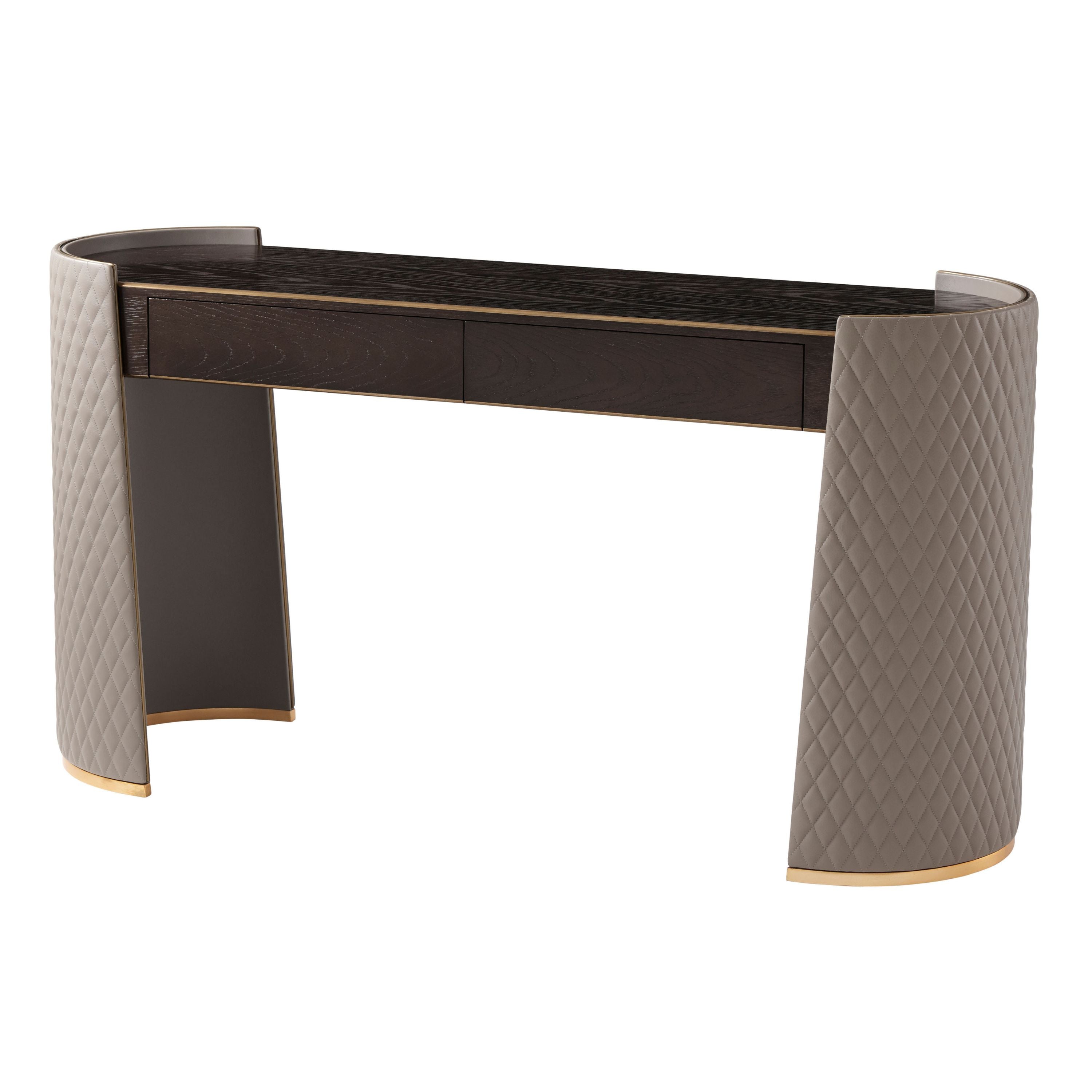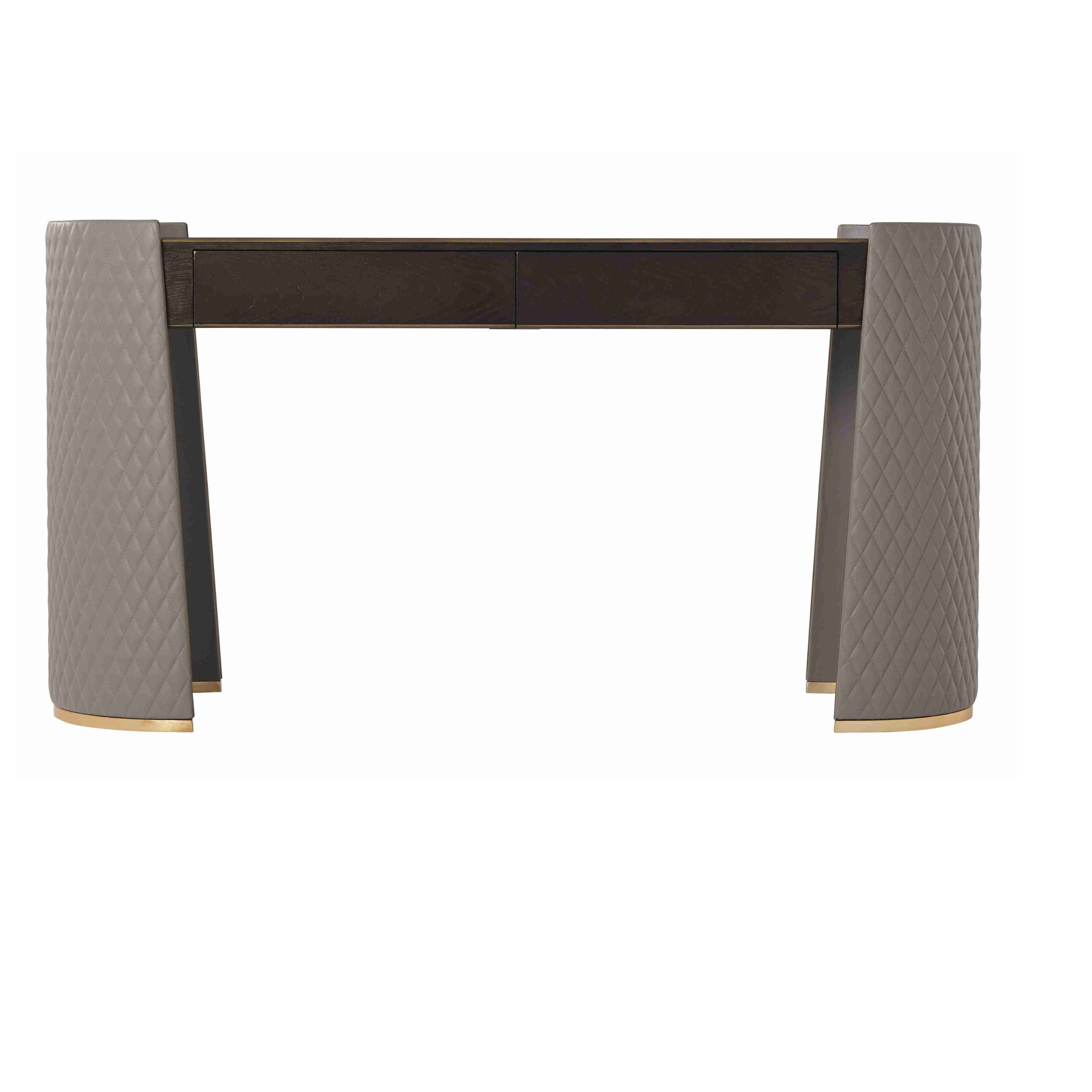 A Gallery Bronze Finish Crown Oak veneer Dressing Table, the rectangular top with Brass Finish Molding Details and two frieze drawers, the Rounded Ends with Diamond Quilted Leather Wrapped Clamped Crescent End Supports and Brass Finish Bases.Soft Closing Drawer Runners