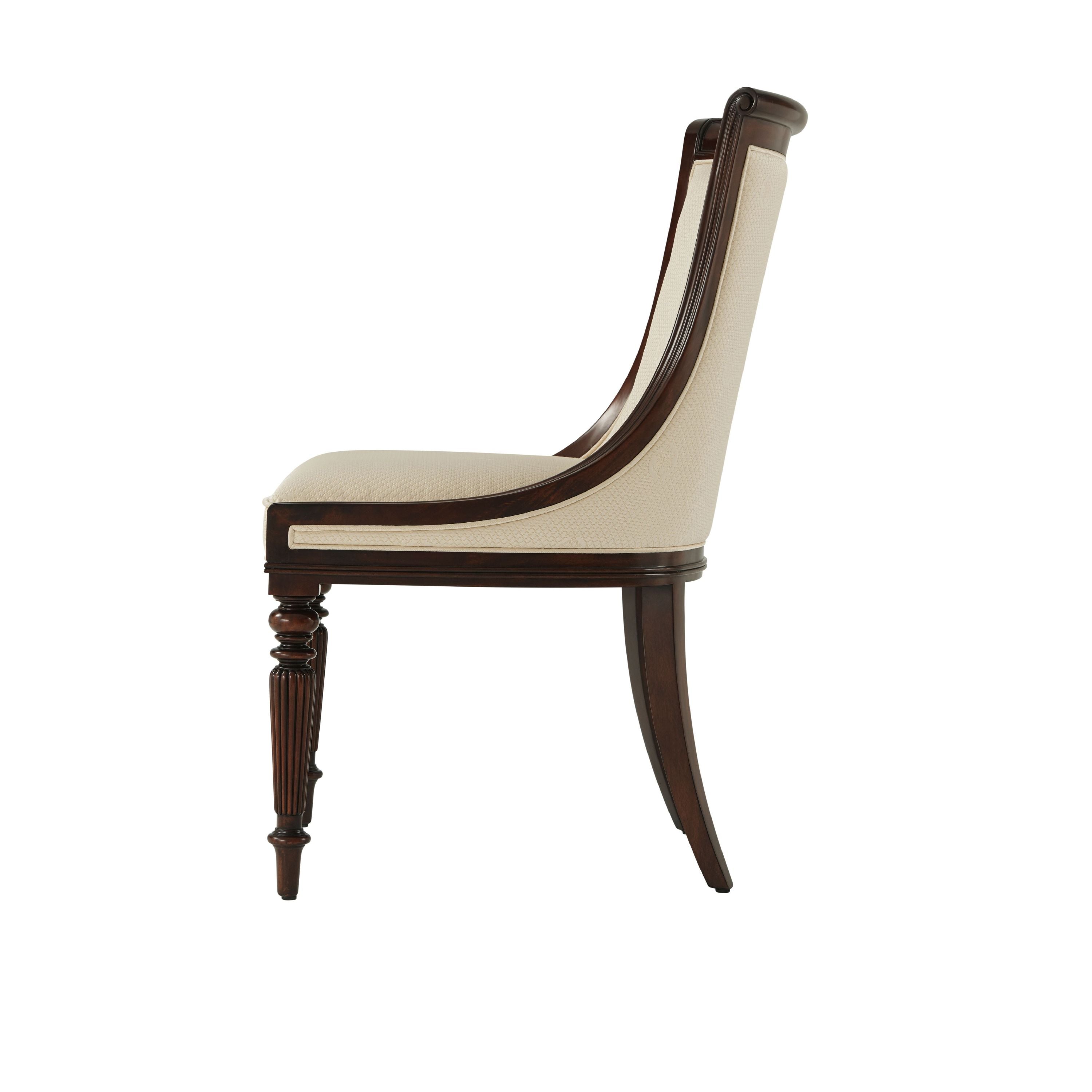 A hand carved mahogany scoop back dining chair, the panelled and upholstered back above an upholstered seat, on turned and reeded legs.