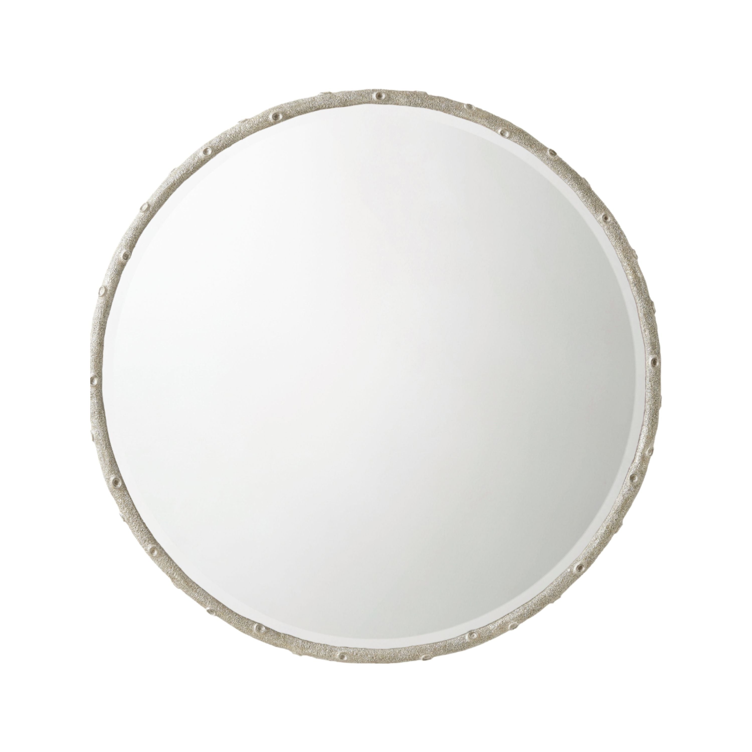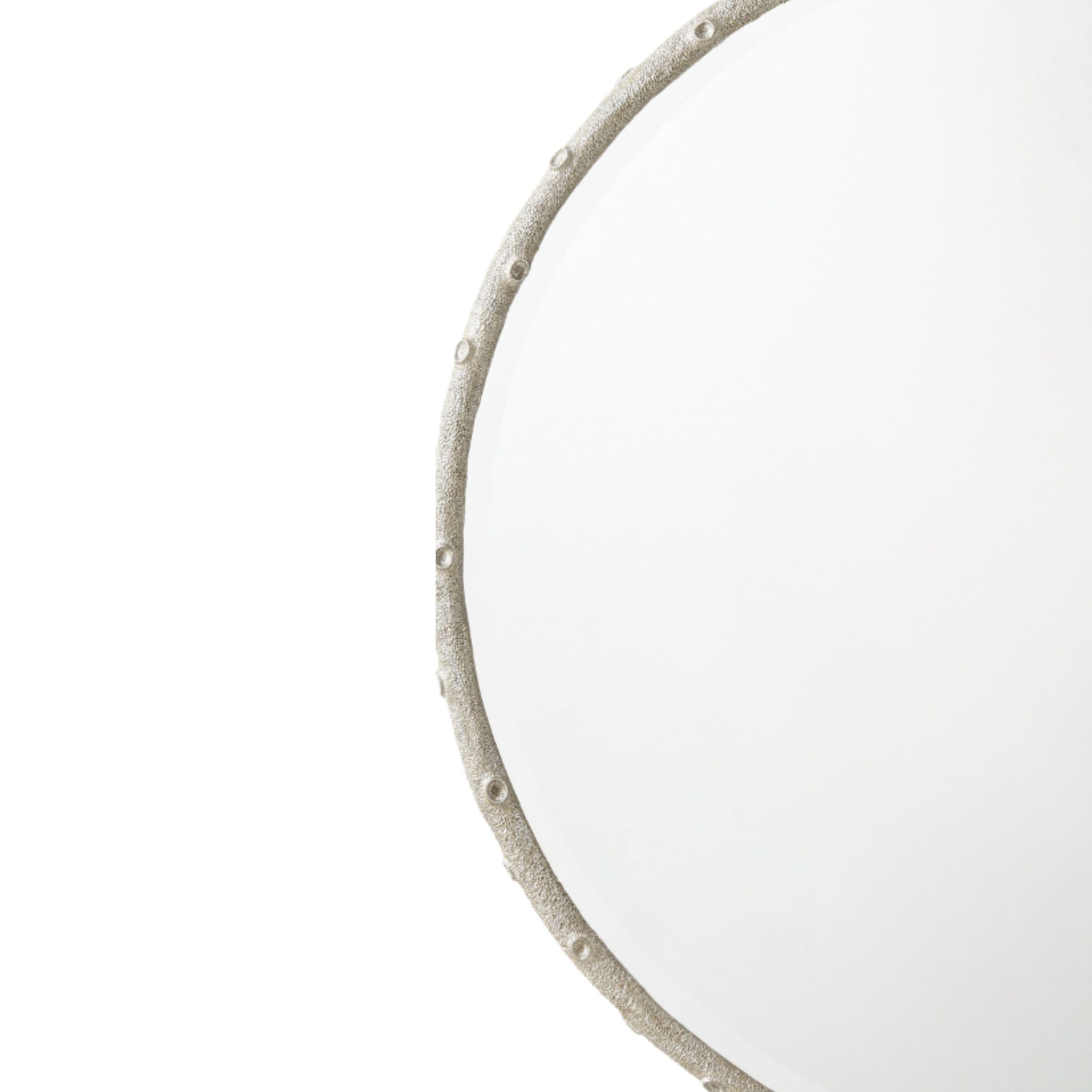 Pearl Finish Coral Cast Aluminium Frame. Circular Bevelled Mirror Plate. Pre-fitted Hanging Strips.