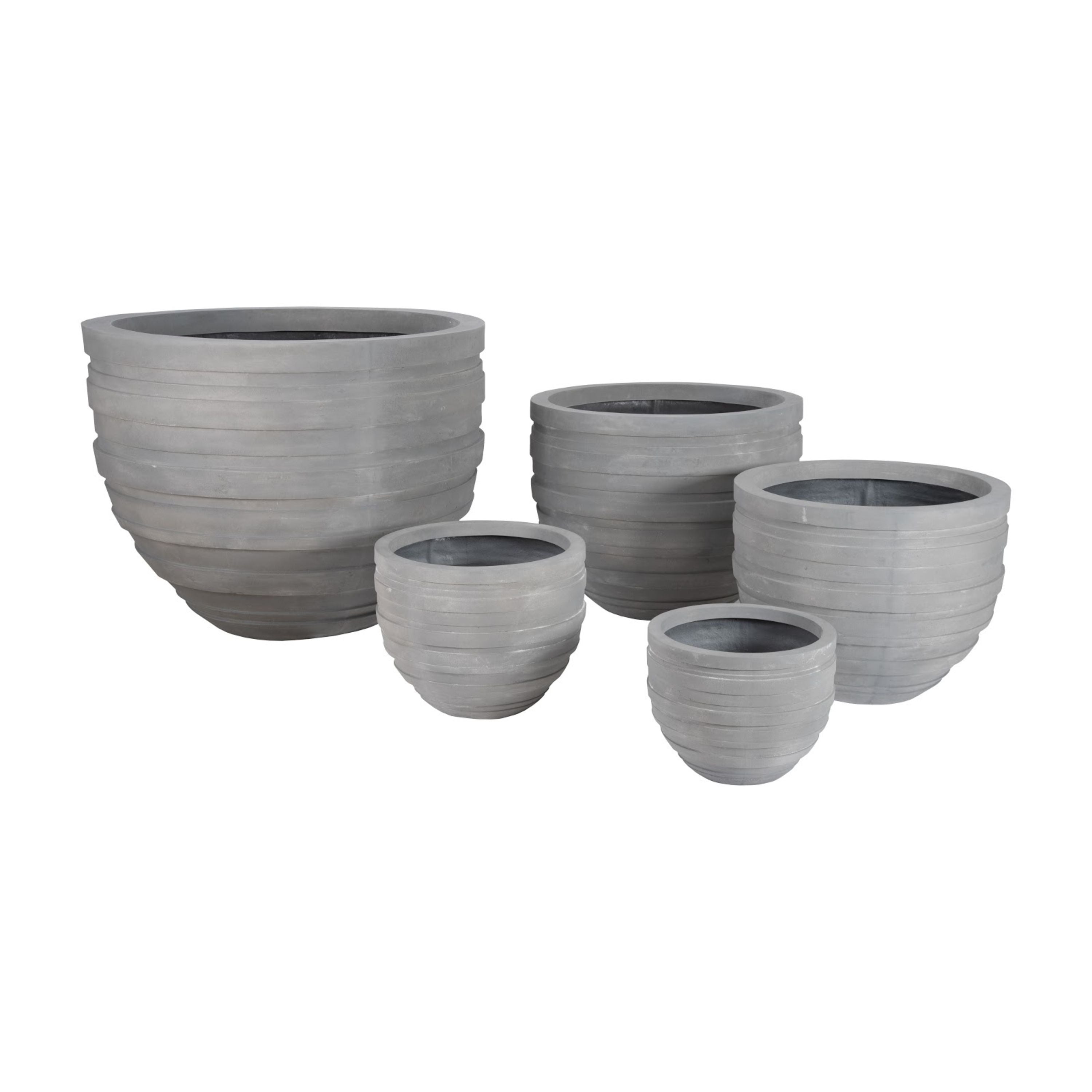 The June Extra-Small Raw Gray Planter looks like a vintage planter with its raw gray finish. Made of composite, its surface is striated to mimic fabric that has been wrapped around a vessel and slathered in a beautiful papier-mâché treatment. One of the loveliest aspects of this design is that it is strikingly contemporary for a garden planter thanks to its warm gray finish and the top lip that rolls into its interior to leave the shape clean-lined. We offer this gray garden planter in a number of sizes and we have white planters in round and square shapes. Each of these reflects the ethos that Phillips Collection personifies: modern organic.The Stone Cast Finish is composed of real crushed stone mixed with resin. This finish is suitable for outdoor and indoor use and has a rough texture like real stone.