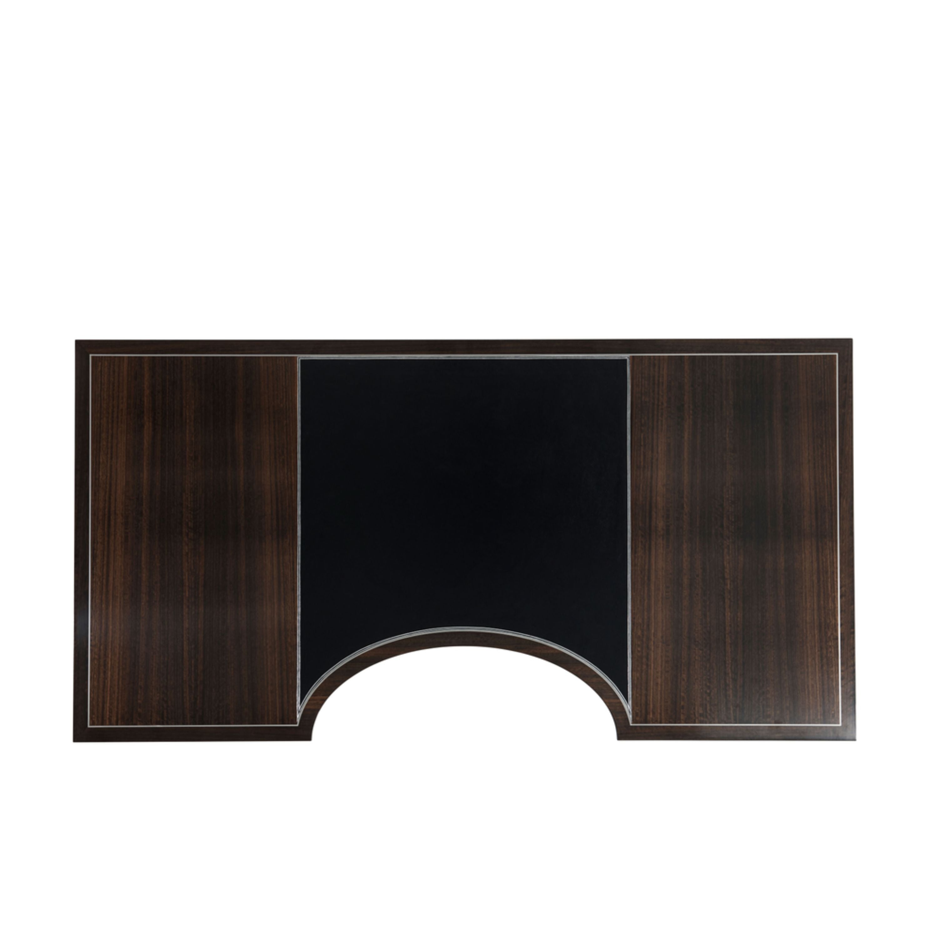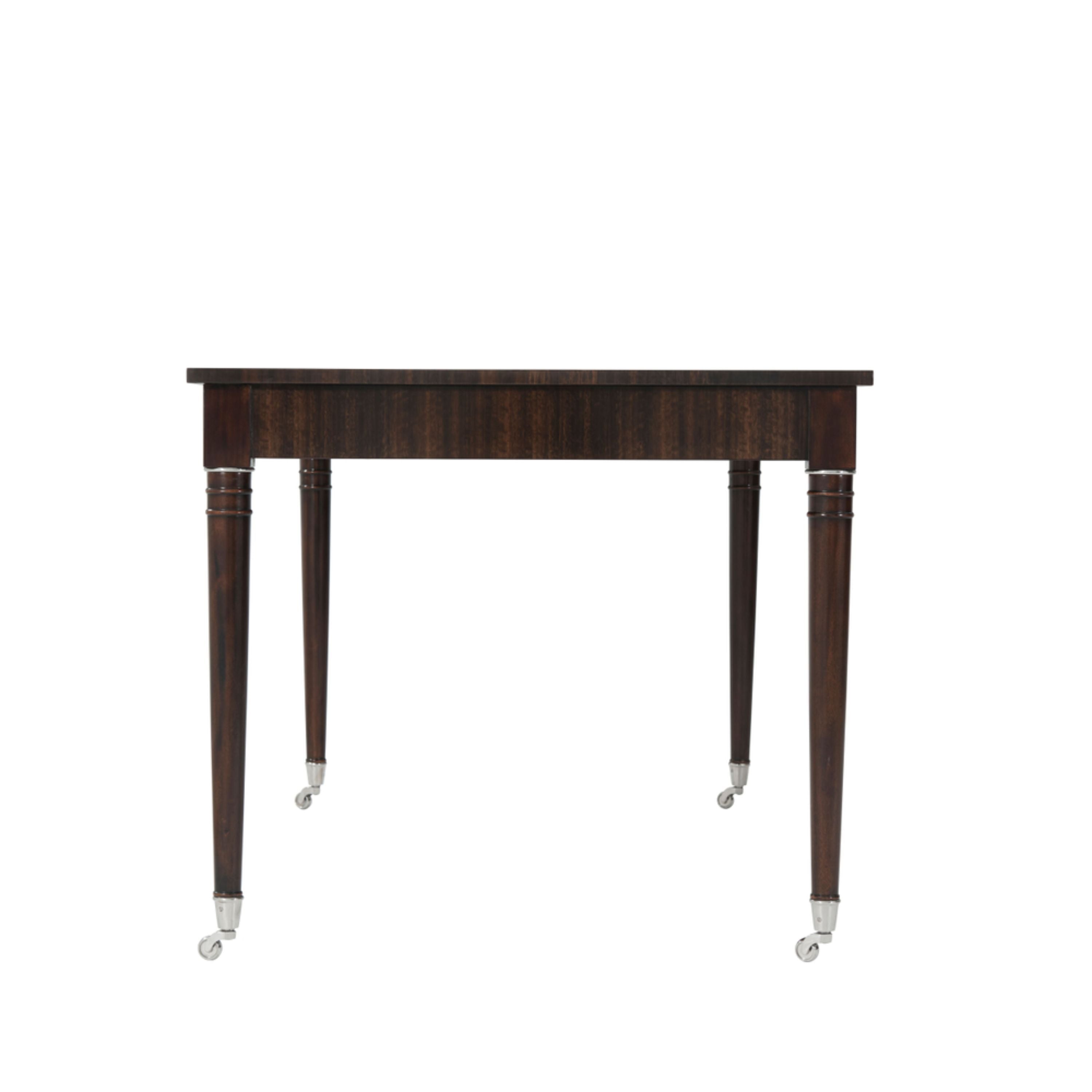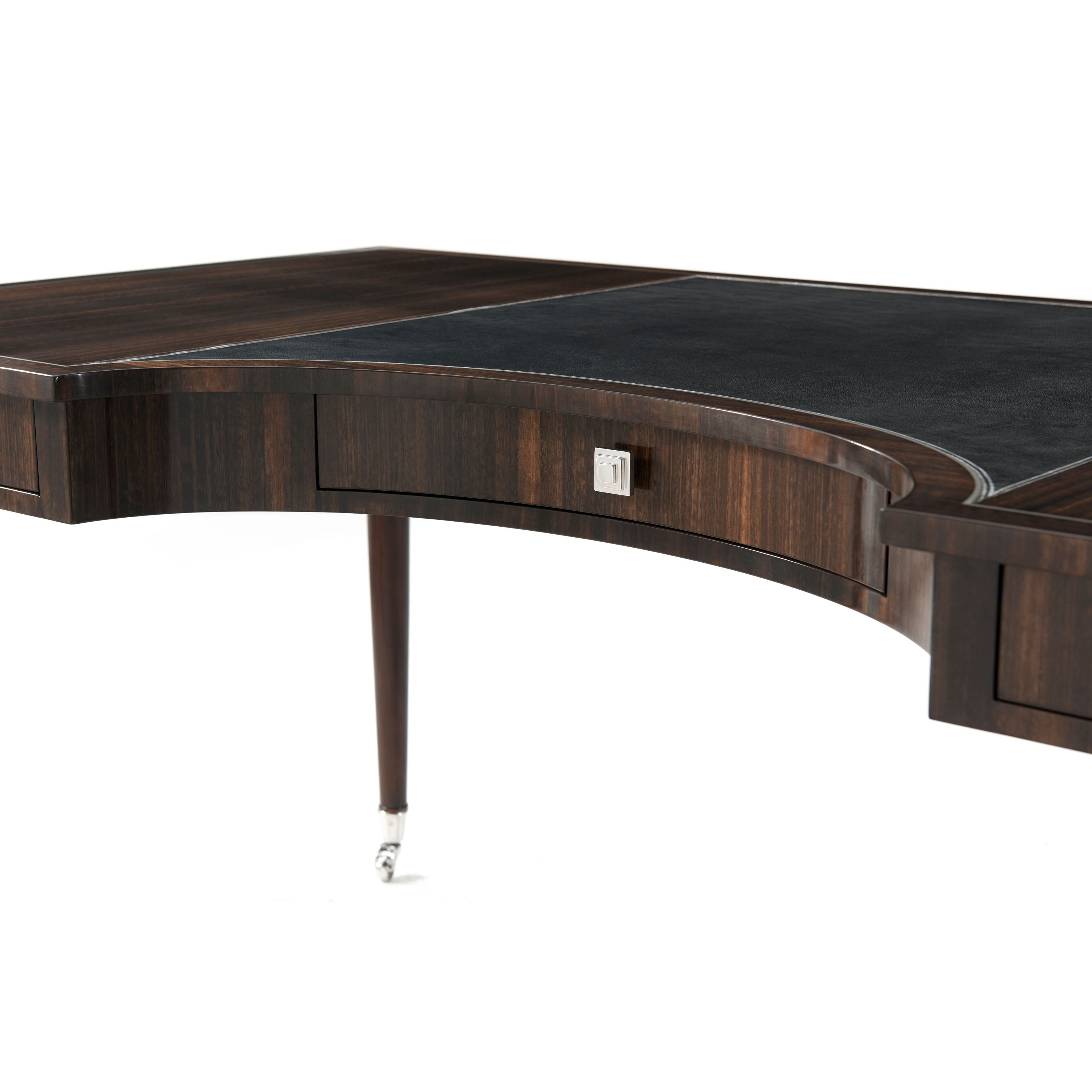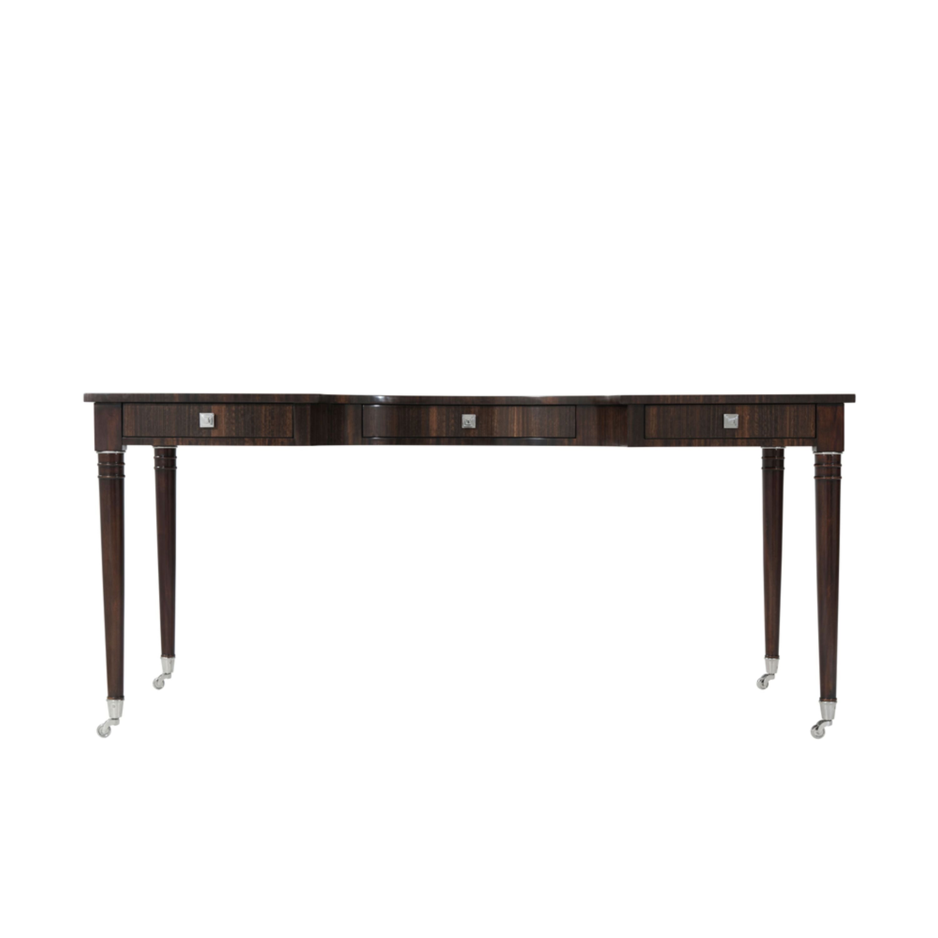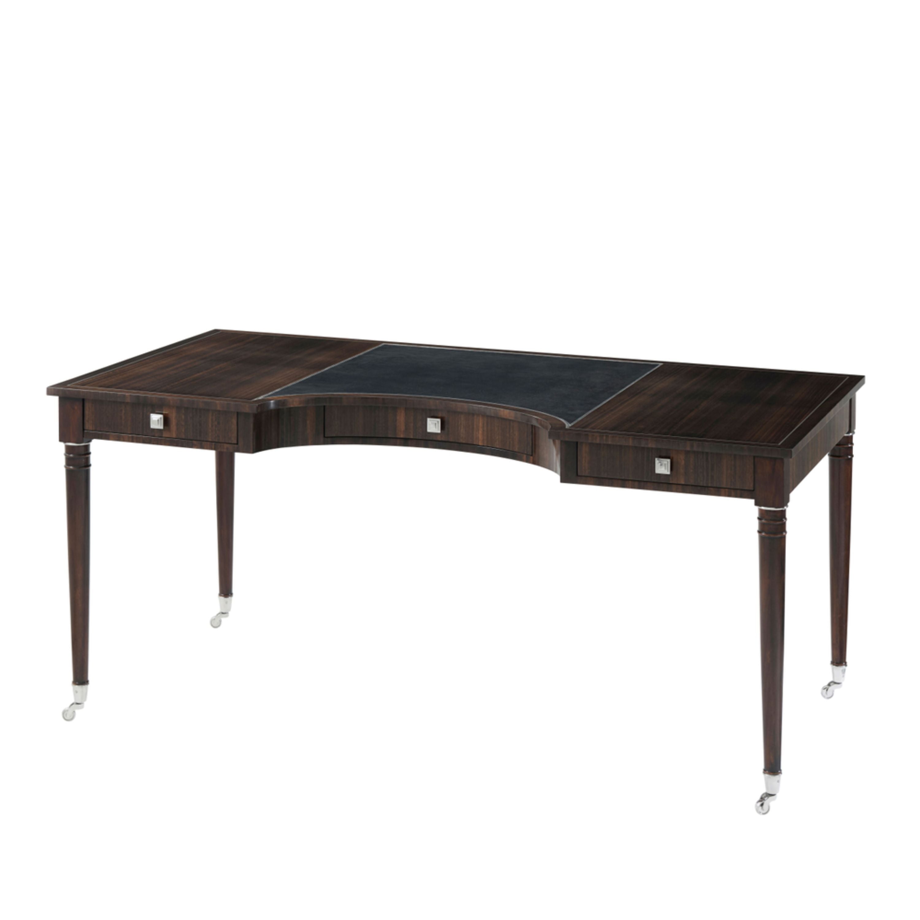 A fumed figured Eucalyptus veneered writing table, the rectangular stainless steel strung top centred by a tooled leather writing surface and a demi lune cut-out, with three frieze drawers with stainless steel handles, on turned legs with stainless steel castors. Inspired by an Art Deco original.