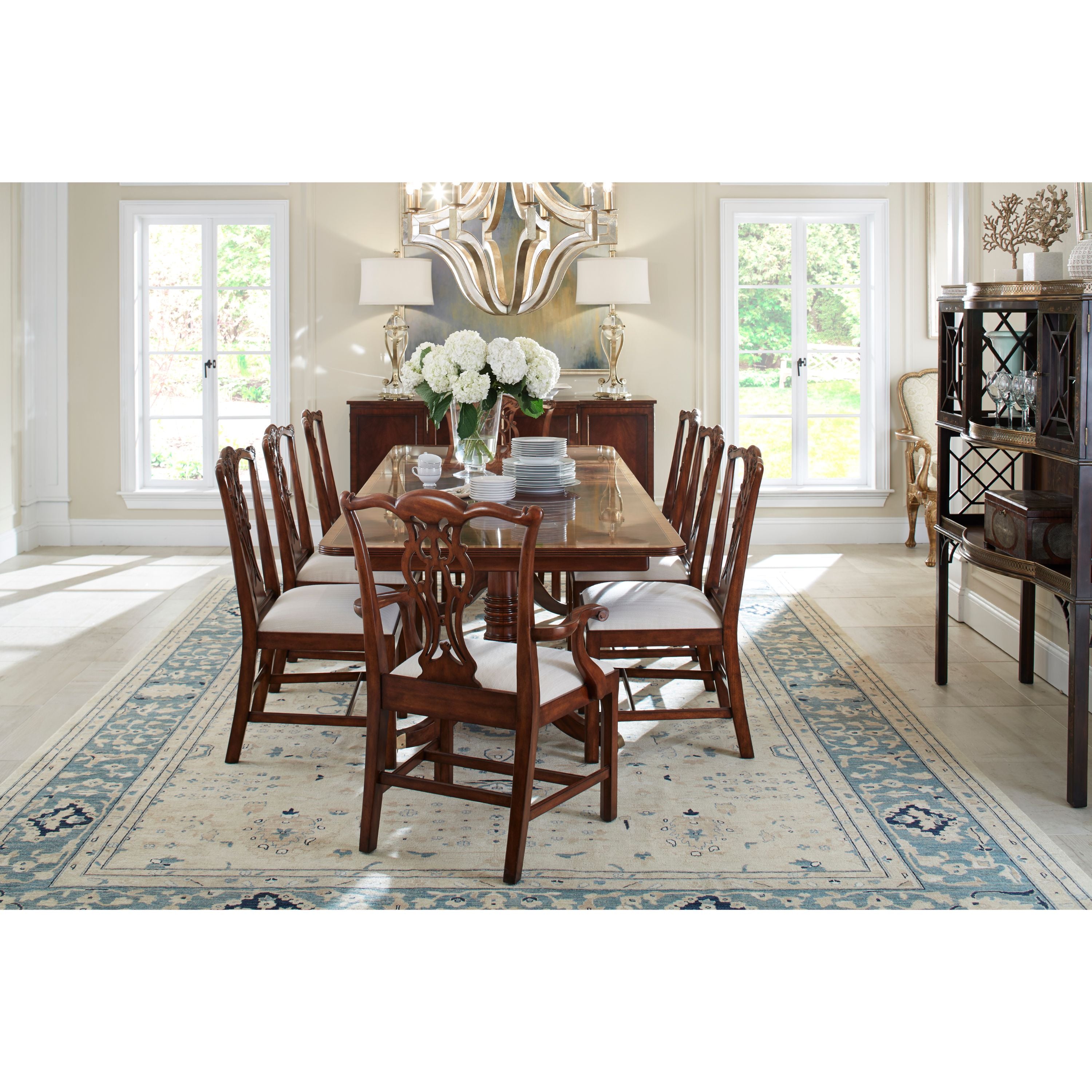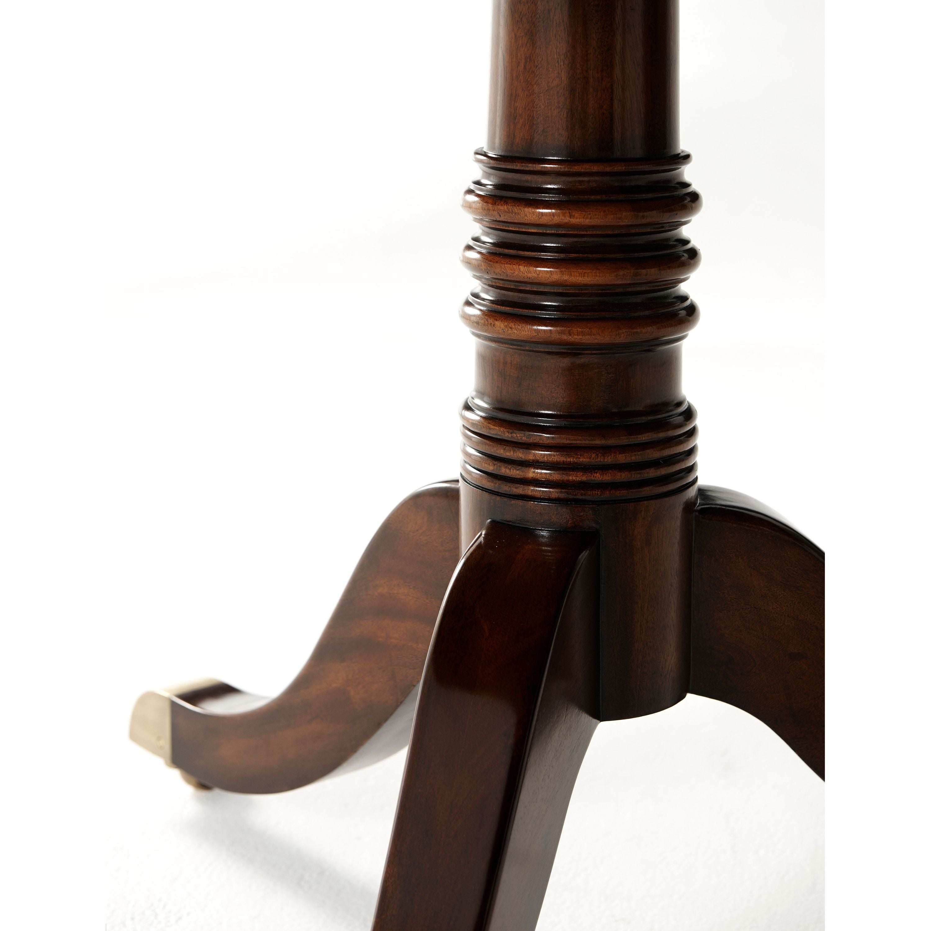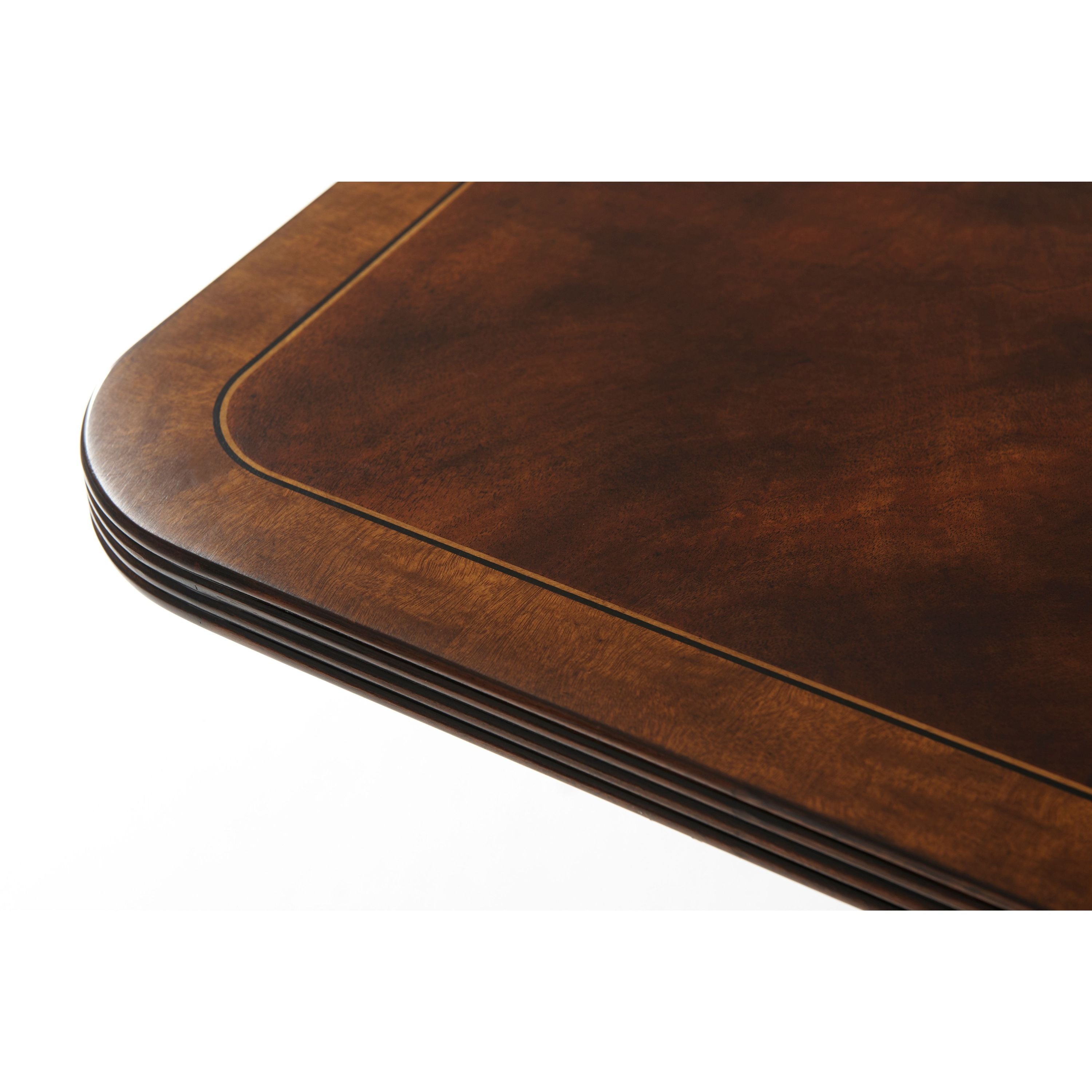 A swirl mahogany veneered dining table, the rectangular reeded edge and satinwood banded top extending to accommodate one additional leaf, on two gun-barrel turned column pedestals with downswept legs terminating in brass cappings and castors. Inspired by a Regency original
