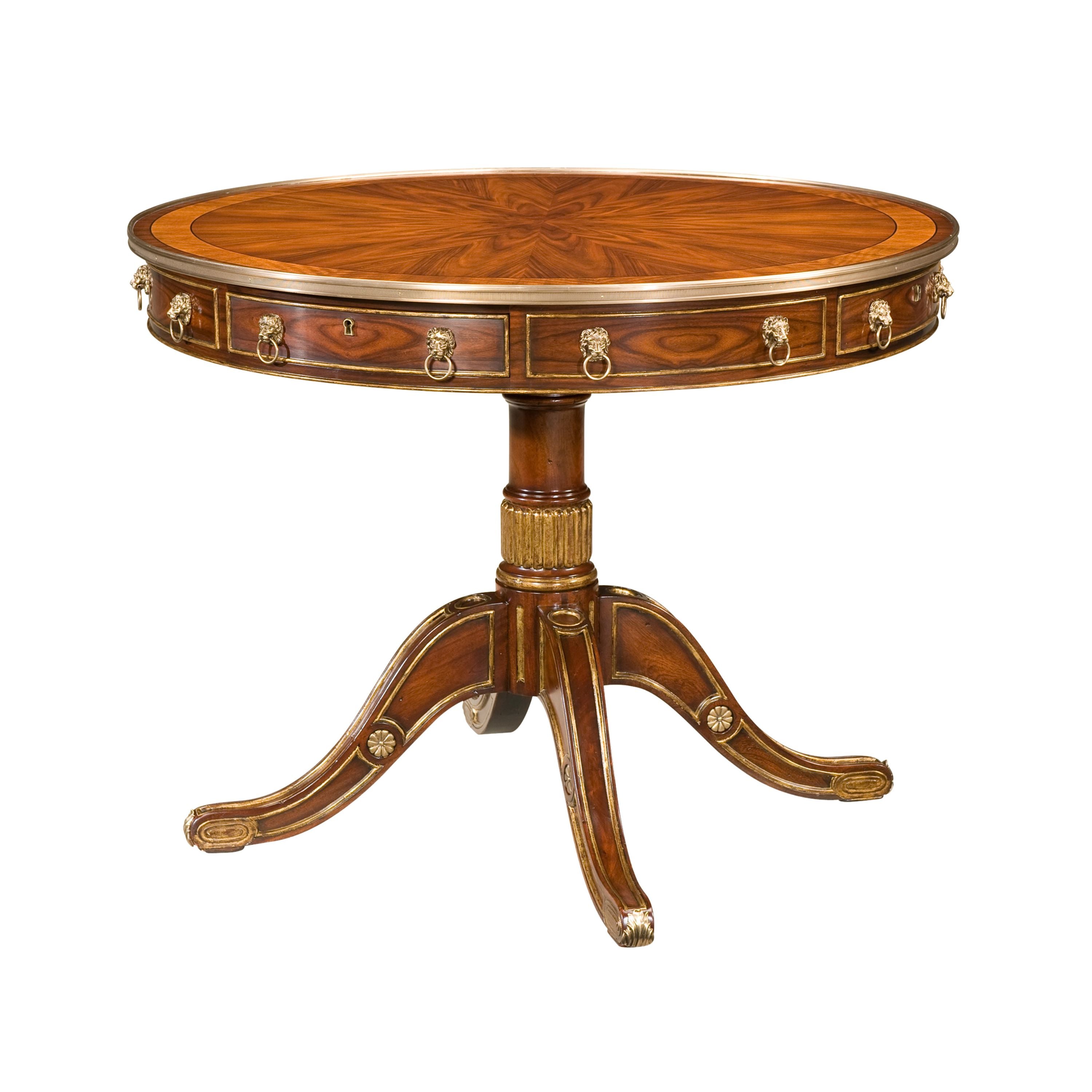 A rosewood and parcel gilt drum top table with mahogany crossbanding, the circular brass bound top above a frieze with four bowed drawers applied with brass lion mask handles and interspersed by four dummy drawers, on a turned and reeded mahogany column with down swept panelled and paterae carved mahogany legs.