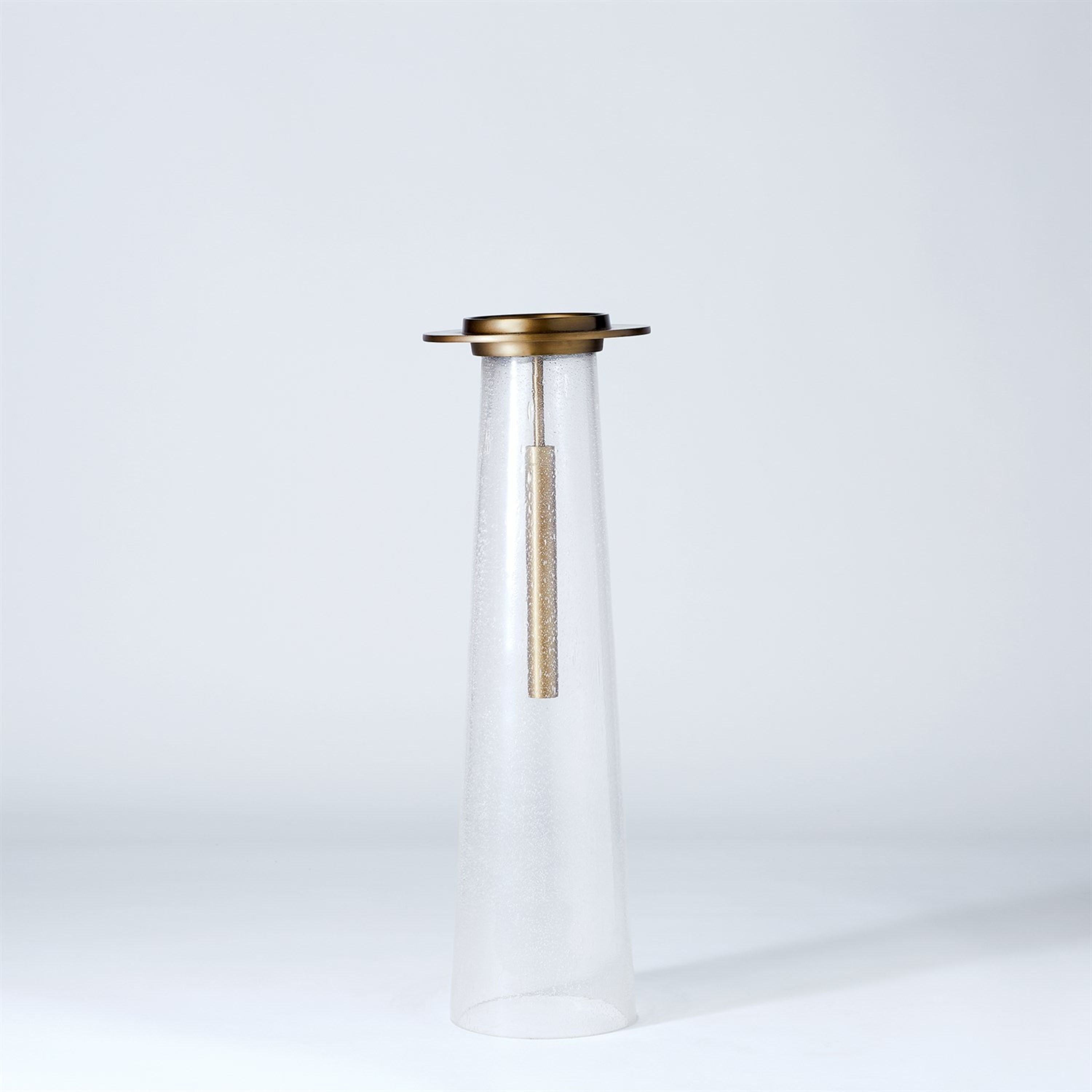 Encased in a softly tapered seeded glass pillar, the antique brass-finished bobeche and stem appear as if they are floating. Available in three sizes. Also available in antique nickel and bronze finishes.
