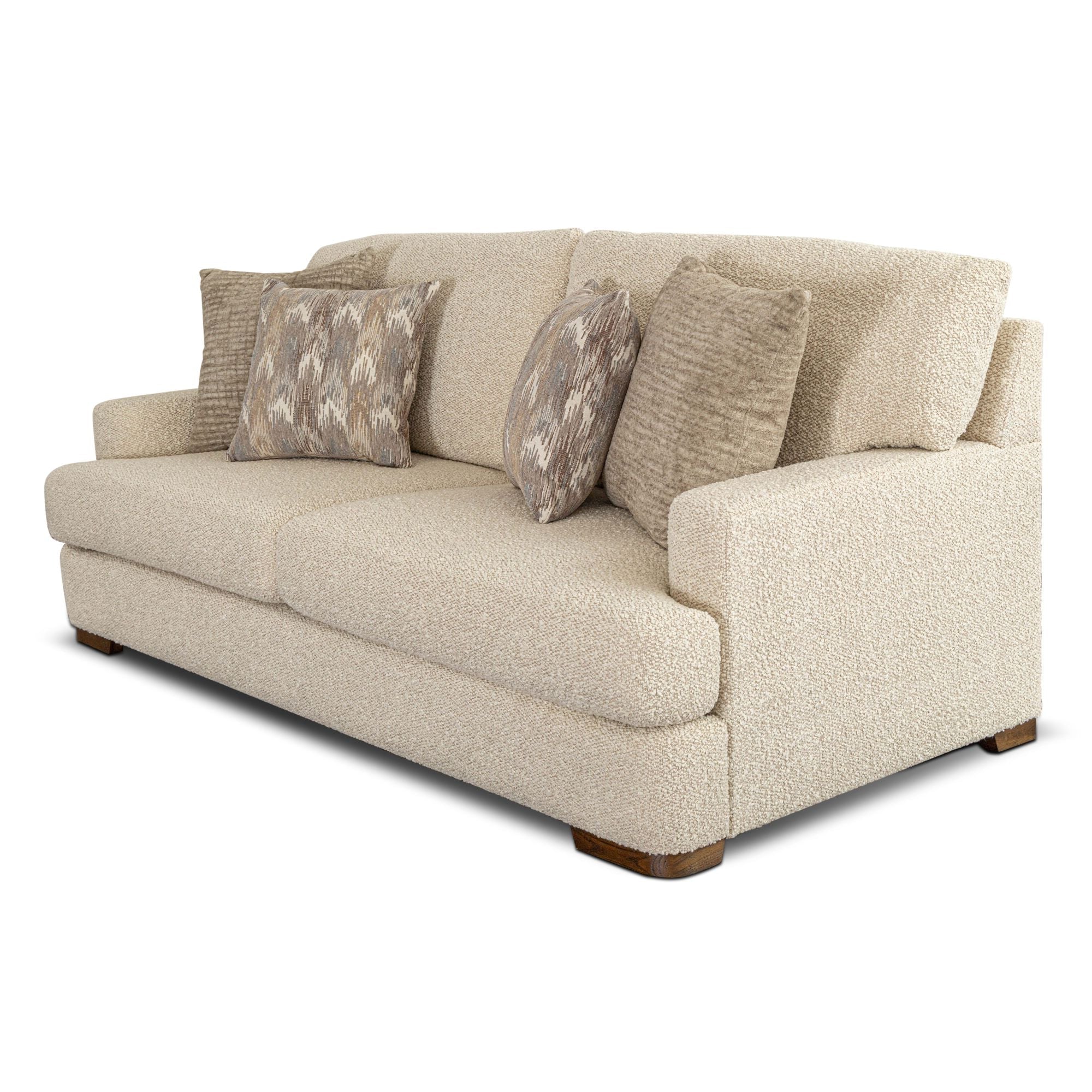 The Aria Tate 3 Seater sofa blends modern elegance with inviting comfort. Upholstered in a Brooklyn soft woven fabric, its wide track arms and plush, deep seats are complemented by a stylish arrangement of textured and patterned accent cushions. The low-profile design sits atop understated wood block feet, adding a grounded touch to its refined silhouette. Perfect for contemporary homes seeking a relaxed yet polished centerpiece.